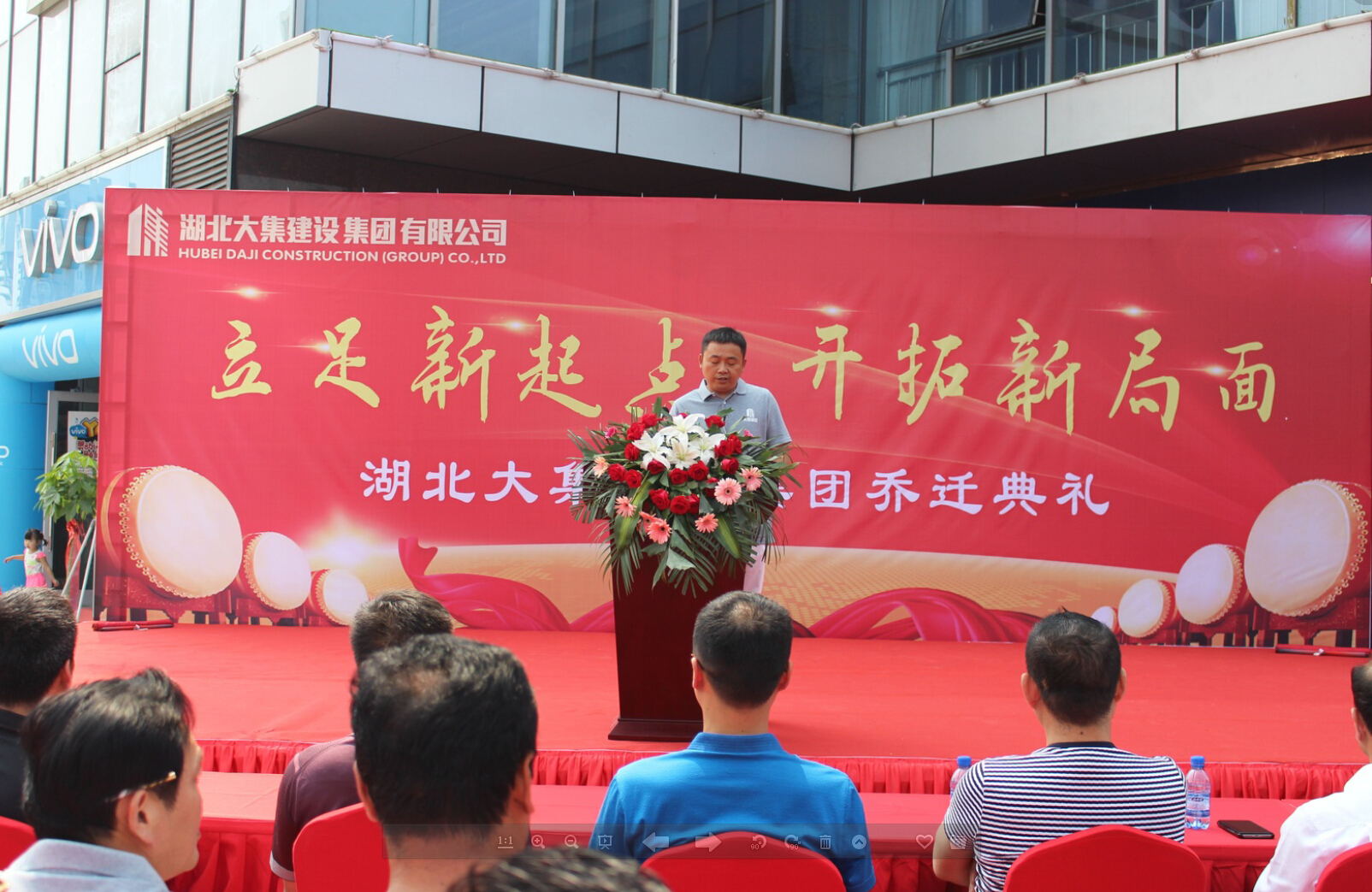 10:18分,在激情高漲的鑼鼓聲中,湖北大集建設(shè)集團(tuán)喬遷典禮正式開(kāi)始。首先,由集團(tuán)董事長(zhǎng)徐濤發(fā)表講話,董事長(zhǎng)再一次向蒞臨現(xiàn)場(chǎng)的各位政府領(lǐng)導(dǎo)、行業(yè)同仁以及來(lái)賓朋友表示歡迎和感謝,然后重點(diǎn)總結(jié)了自2003年改制以來(lái)集團(tuán)的發(fā)展、壯大、收獲和成就,并表示集團(tuán)將以此次喬遷為契機(jī),繼續(xù)保持開(kāi)拓進(jìn)取的積極狀態(tài)和務(wù)實(shí)求真的工作作風(fēng),在各級(jí)政府領(lǐng)導(dǎo)的支持下,各位同仁朋友的關(guān)心幫助下,努力創(chuàng)造更加輝煌的明天!