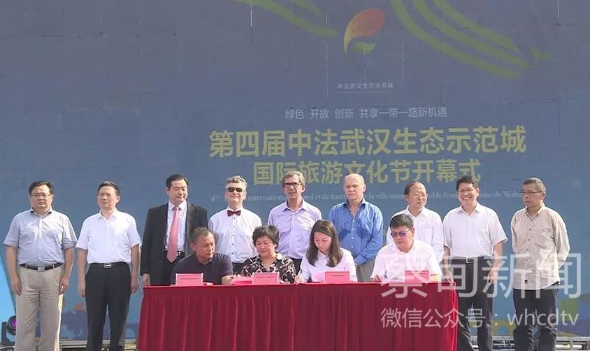 蔡甸區(qū)區(qū)長彭巧娣與法國法中之家旅行集團(tuán)、武漢朝宗文化旅游有限公司以及湖北中競體育文化傳播有限公司簽訂合作協(xié)議。