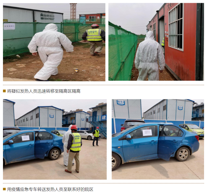 本次演練現(xiàn)場模擬一例疑似發(fā)熱患者,從被發(fā)現(xiàn)到應急處理的全過程。演練內容包括情況上報、項目應急預案啟動、緊急隔離、送醫(yī)、現(xiàn)場消毒等環(huán)節(jié)。整個演練過程緊張有序、防疫物資標準齊全、保障到位,參加演練人員反應迅速、配合默契、職責明確,達到了預期效果。