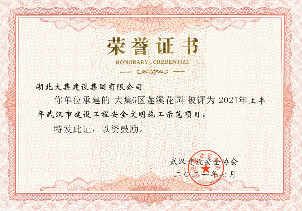近日,由集團(tuán)公司承建的“大集G區(qū)蓮溪花園項(xiàng)目”和“蔡甸區(qū)公用人防項(xiàng)目”榮獲“2021年上半年武漢市建設(shè)工程安全文明施工示范項(xiàng)目”稱號(hào)。此項(xiàng)榮譽(yù)的獲得是對項(xiàng)目安全生產(chǎn)和文明施工管理的充分肯定,也為公司進(jìn)一步推進(jìn)安全標(biāo)準(zhǔn)化奠定了堅(jiān)實(shí)基礎(chǔ)。