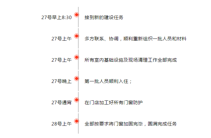 可一想到防疫工作刻不容緩,王總只能想方設(shè)法地四處發(fā)動(dòng)關(guān)系,與施工人員說好話,明大義,合理優(yōu)化工序,盡可能地壓縮施工時(shí)間,想盡一切辦法做好人員的防護(hù)安全,最終緊急組織起15人的施工團(tuán)隊(duì),并在當(dāng)天做好所有的材料安排和后勤保障工作,從2號(hào)早上7:00,所有工作開始有條不紊又緊張忙碌地進(jìn)行著,大家加班加點(diǎn),一直工作到深夜12:00順利完工,項(xiàng)目團(tuán)隊(duì)當(dāng)場(chǎng)與業(yè)主方領(lǐng)導(dǎo)進(jìn)行交付驗(yàn)收,順利地在最短的時(shí)間內(nèi)圓滿交付第三次施工任務(wù)!