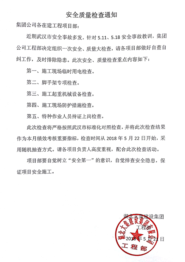 為進一步貫徹落實集團公司“安全生產(chǎn)重于泰山”的管理理念,5月21日,工程部下發(fā)質(zhì)量安全檢查通知,并成立質(zhì)量安全檢查組,自5月22日起隨機對集團在建項目施工現(xiàn)場進行安全檢查,嚴(yán)密排查施工現(xiàn)場的安全隱患,確保各項目安全施工工作順利開展。