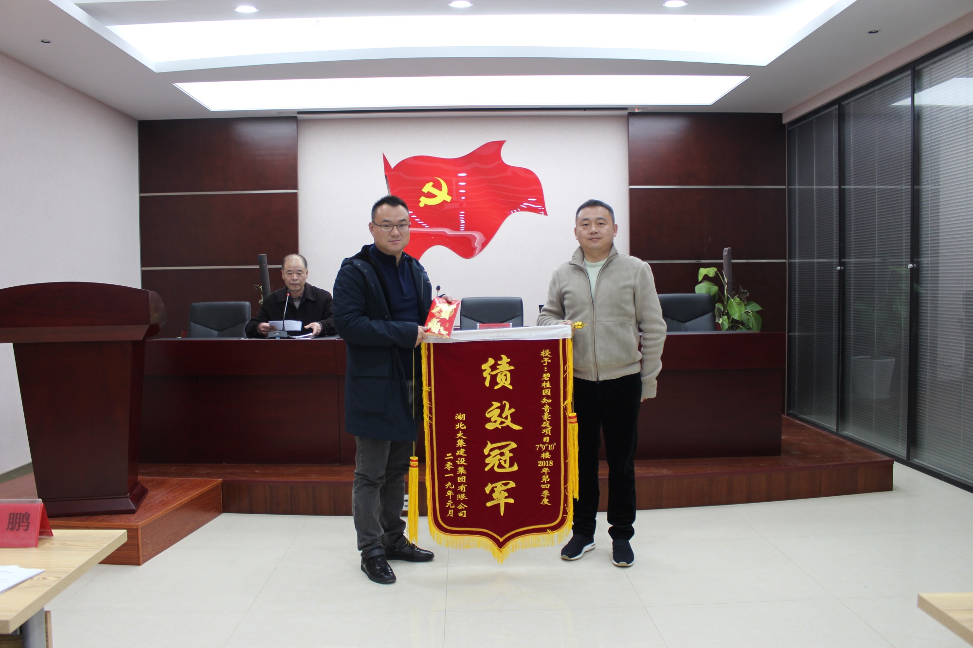 會議開始,集團董事長徐濤為2018年第四季度項目績效冠軍——碧桂園知音豪庭7、9、10#頒發(fā)錦旗和獎金。