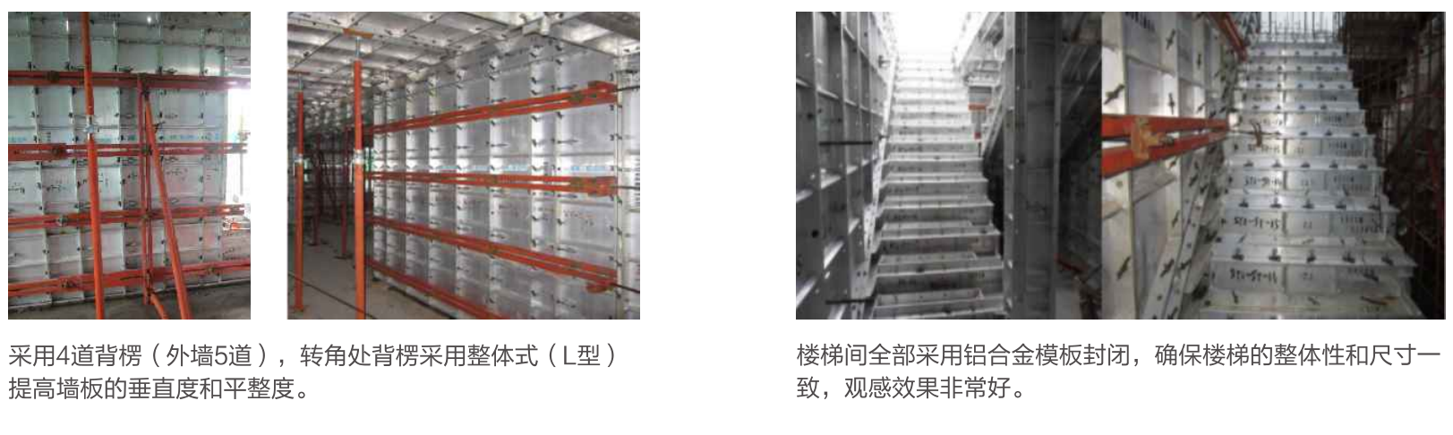 模板系統(tǒng)構(gòu)成混凝土結(jié)構(gòu)施工所需的封閉面,保證混凝土澆灌時(shí)建筑結(jié)構(gòu)成型;支撐系統(tǒng)在混凝土結(jié)構(gòu)施工過程中起支撐作用,保證樓面、梁底及懸挑結(jié)構(gòu)的支撐穩(wěn)固;緊固系統(tǒng)是保證模板成型的結(jié)構(gòu)寬度尺寸,在澆注混凝土過程中不產(chǎn)生變形,模板不出現(xiàn)漲模、爆模現(xiàn)象;附件系統(tǒng)為模板的連接構(gòu)件,使單件模板連接成系統(tǒng),組成整體。該技術(shù)增加了混凝土的成型質(zhì)量和感觀質(zhì)量。